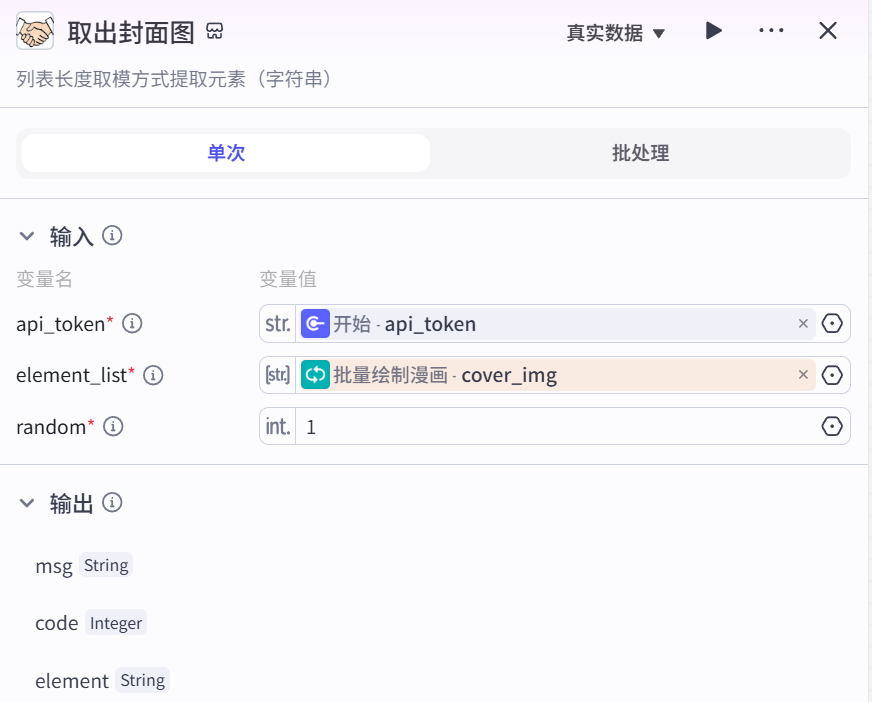 把第一张图片从封面列表中取出,使用到了扣子的三方插件【列表工具合集】的【get_string_ele_by_mod】工具。