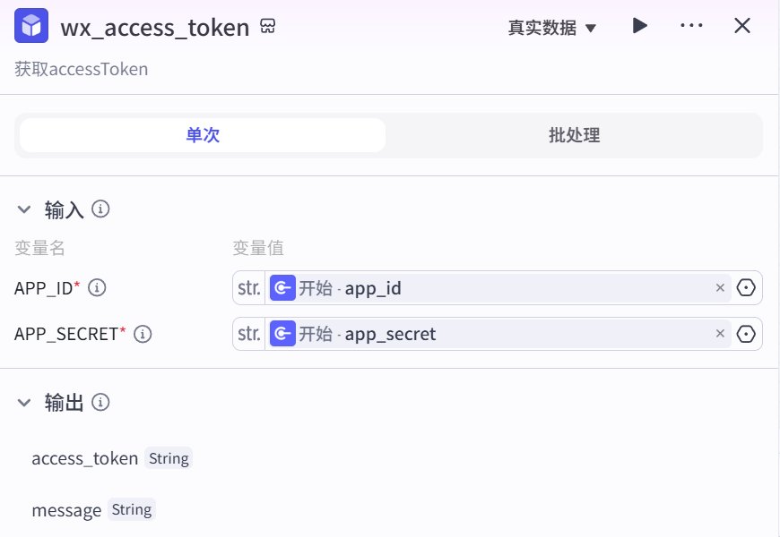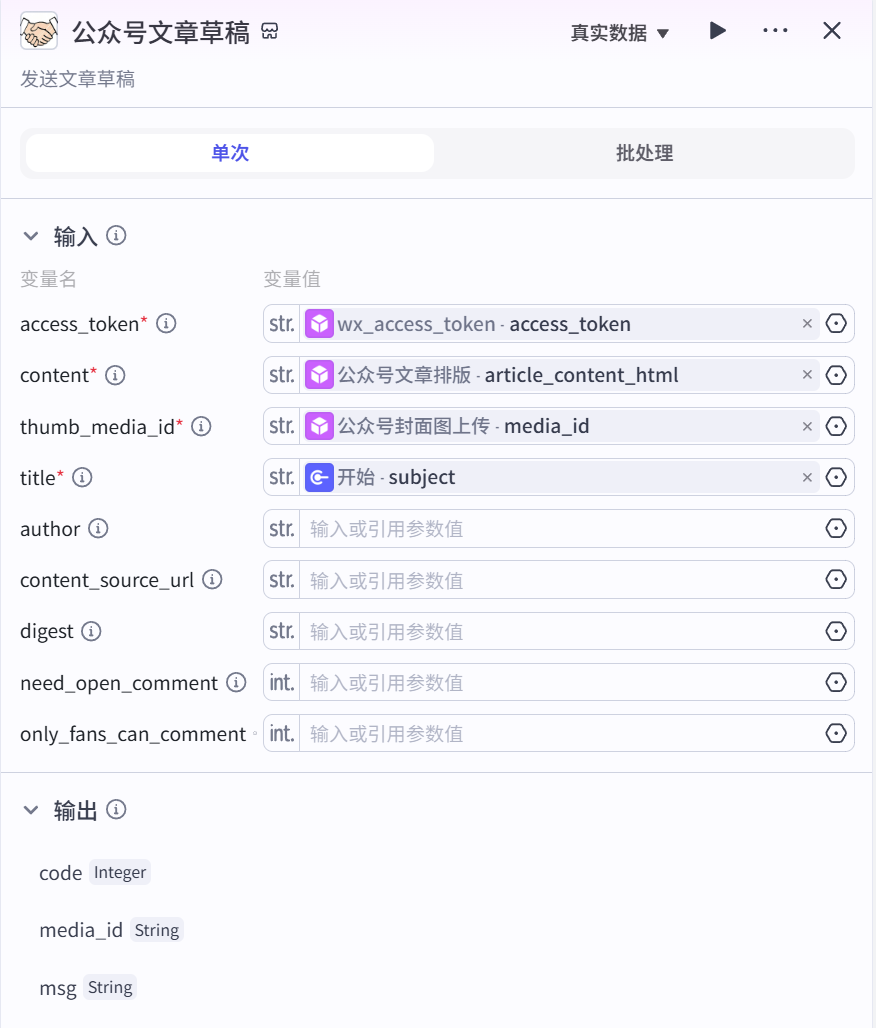 这个节点用于获取公众号接口调用认证,后面的上传图片、发送文章草稿需要使用到,使用到了扣子三方插件【微信公众号助手】的【wx_access_token】工具。
