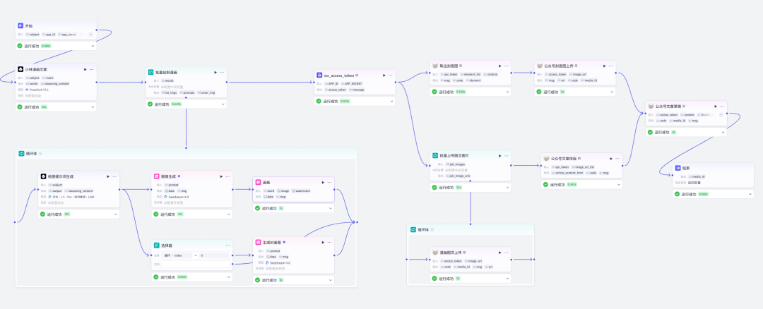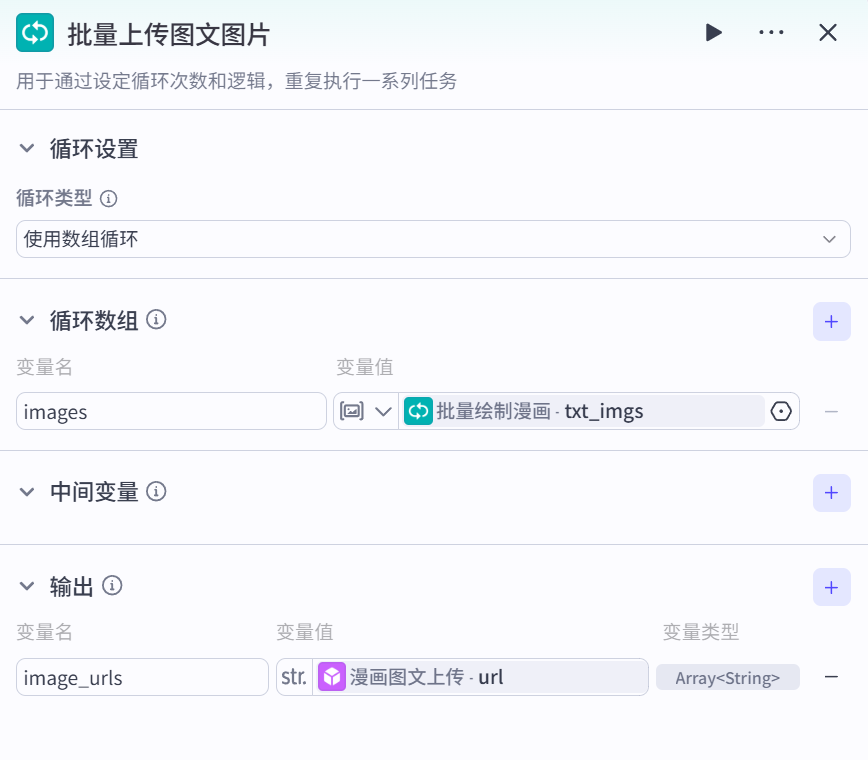 这个地方使用到了扣子的循环节点,用来批量上传漫画图文图片到公众号素材库。
