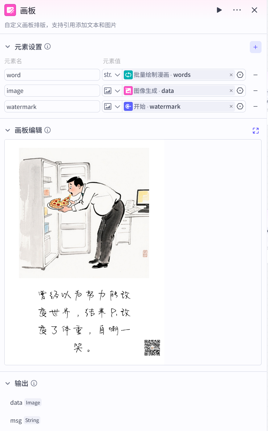 这个节点用于把漫画图片和漫画文案进行合成,使用到了官方的画板节点。