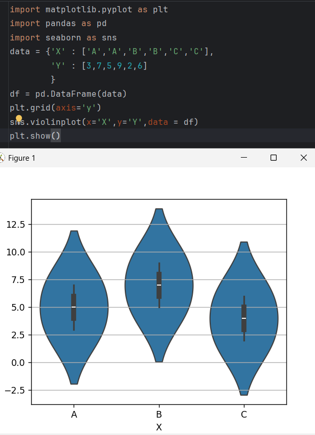 函数既能展示数据的统计分位数(如中位数、四分位数),又能通过 violin 的形状呈现数据的密度分布。它比箱线图提供了更多关于数据分布形状的信息,适合用于展示数据在不同类别下的分布差异。