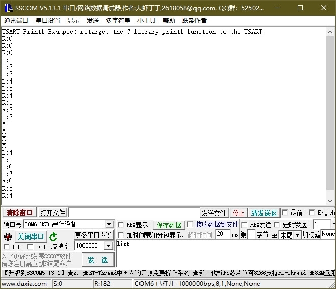 分享HK32F030MF4P6 旋钮编码开关例程,检测灵敏,基本无误触发。 串口助手窗口中,L表示向左旋转,R表示向右旋转,M表示中键按下,程序上每检测到一次L操作,变量数值加1,每检测到一次R操作,变量数值减1。