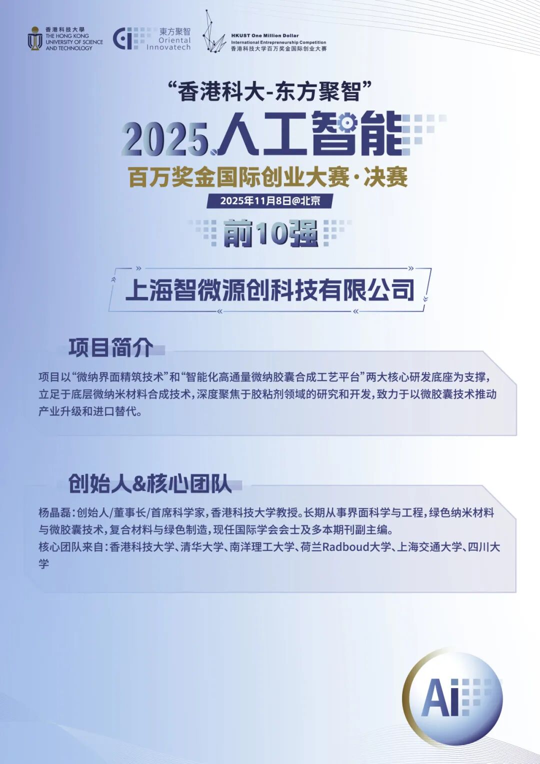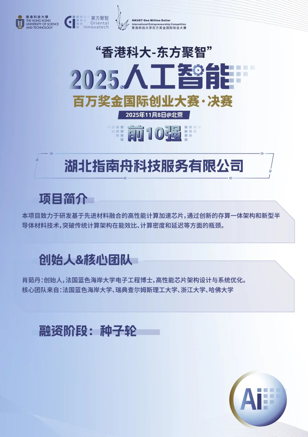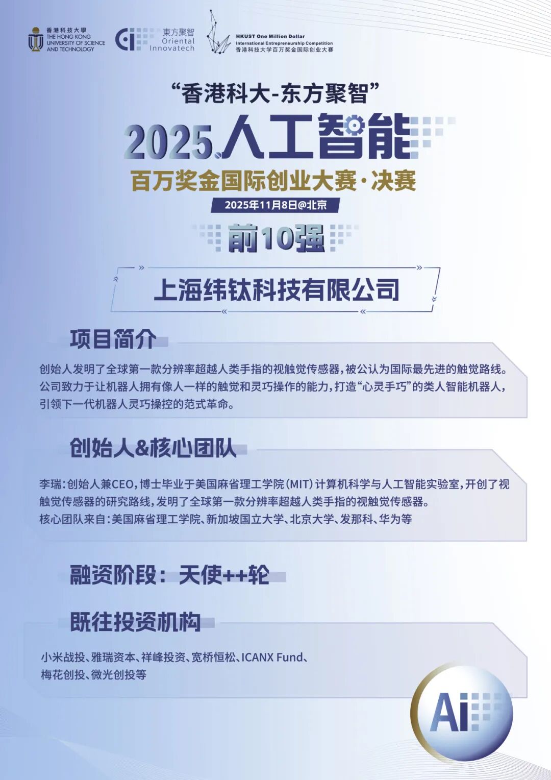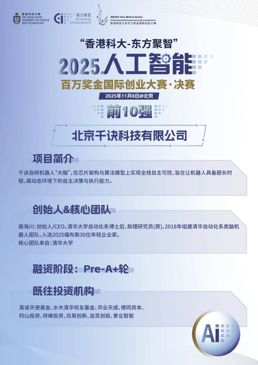 经过激烈的角逐,北京千诀科技有限公司、北京析光科技有限公司、光子芯力(北京)科技有限公司、湖北指南舟科技服务有限公司、脉冲视觉(北京)科技有限公司、明视脑机科技(苏州)有限公司、上海纬钛科技有限公司、上海智微源创科技有限公司、深圳市灵驱科技有限公司、HONGKONG WIENER INTELLIGENCE TECHNOLOGIES LIMITED凭借卓越的技术创新性与商业价值,成功晋级“香港科大-东方聚智”2025[人工智能]百万奖金国际创业大赛决赛前10强!并将在11月7日于北京现场竞逐总金额¥100万元的现金大奖!