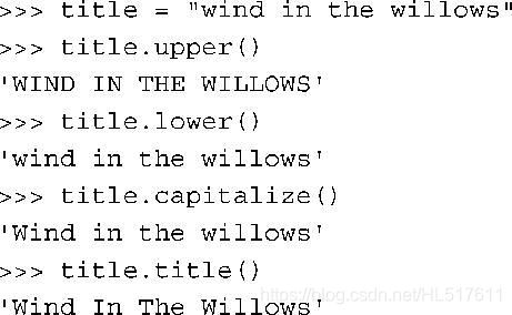 除此之外,还有.capitalize( )把字符串的首字母大写,其余的转小写 和 把首字母以及每个空格或者标点符号后面的字母转换为大写,其他字母转小写 .title( )