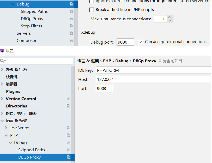 之后对PHPStorm进行debug配置,路径 文件->设置->语言框架->php->debug,将debugport改为9000,同时将DBGp Proxy中的id key 改为PHPSTORM。