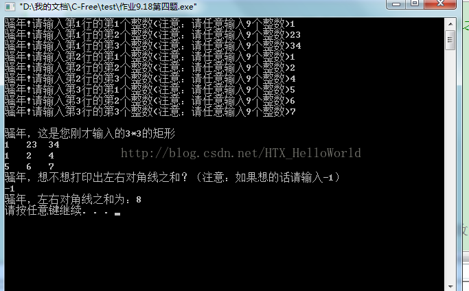 printf("骚年,想不想打印出左右对角线之和?(注意:如果想的话请输入-1)\n");
