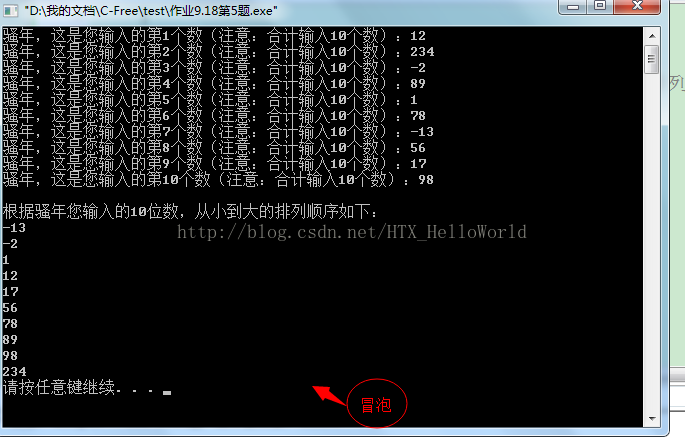 5、用户任意输入10个数,把它们按从小到大排序。(冒泡排序)