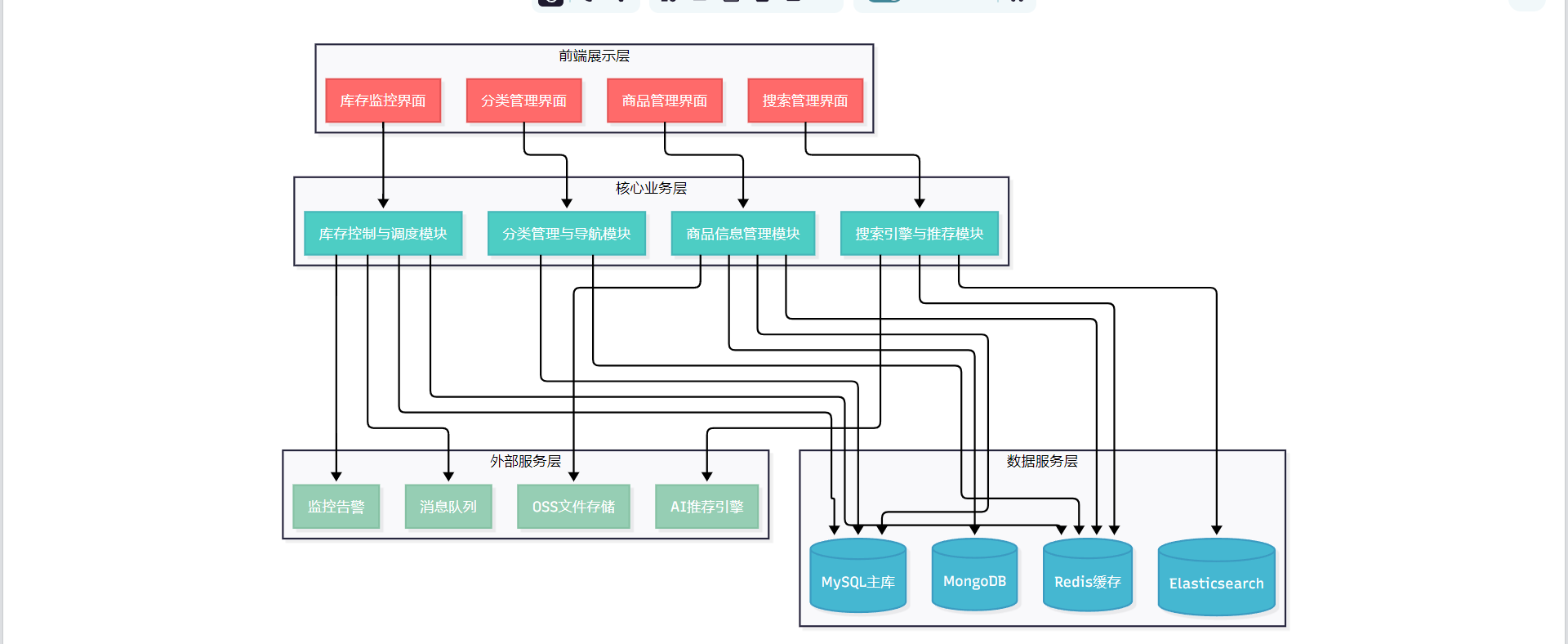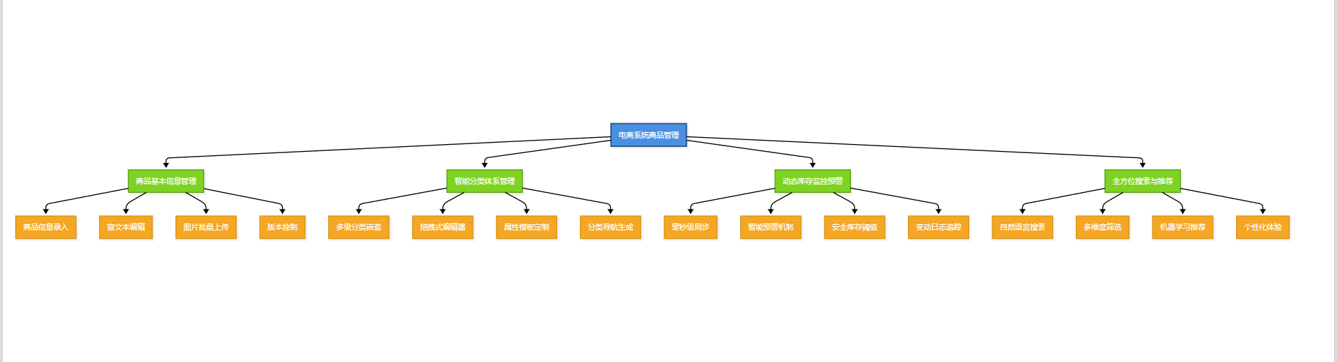 核心功能模块包括:1)商品信息管理-实现商品CRUD操作、富文本编辑、图片上传、版本控制;2)智能分类管理-构建多级分类树、拖拽编辑器、属性模板配置;3)动态库存控制-实时库存同步、智能预警、多仓库调度;4)搜索推荐引擎-全文检索、个性化推荐算法集成。
