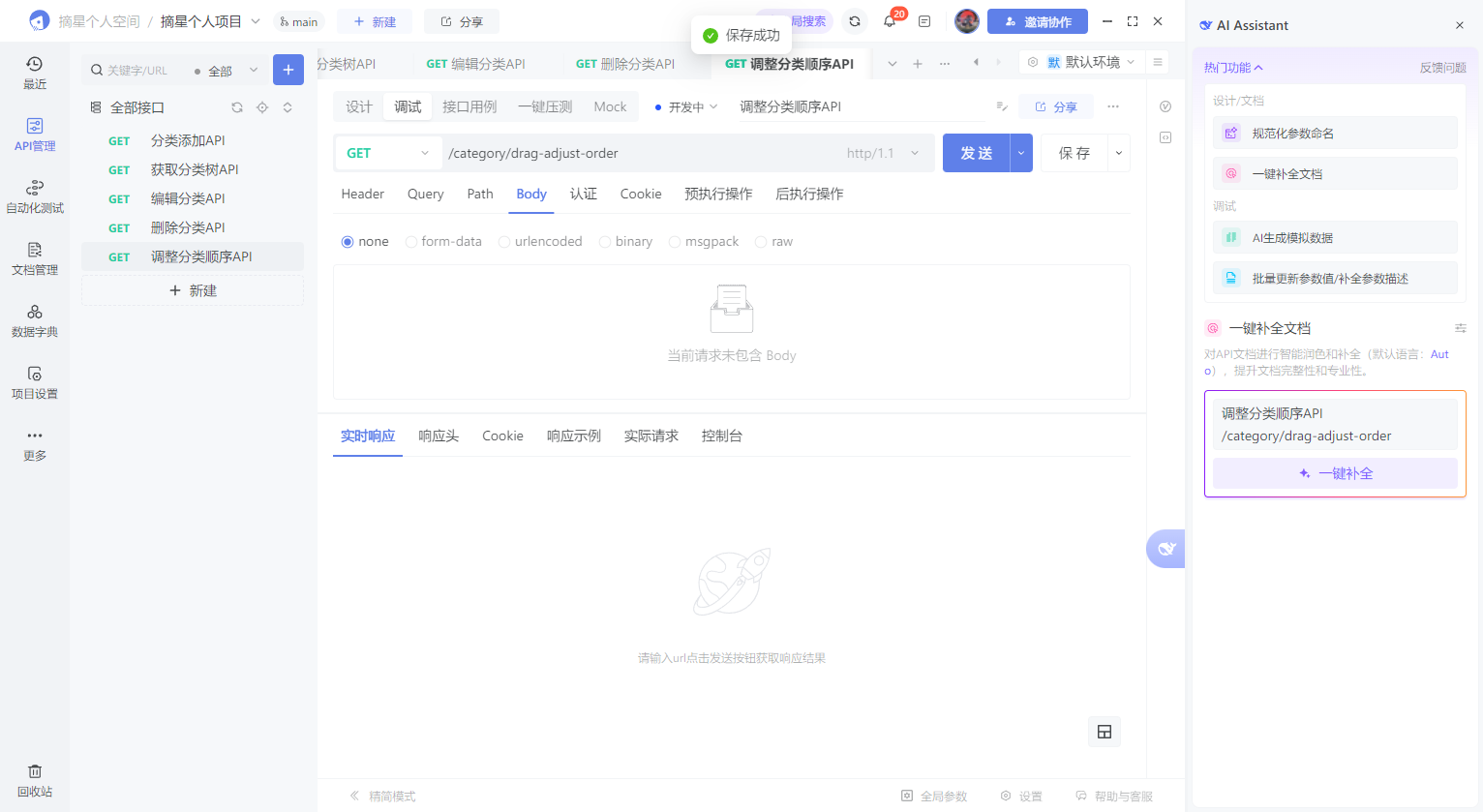 | 拖拽调整分类 | 必填: - categoryId(分类ID) - targetParentId(目标父级ID) - sortOrder(排序序号) | 1. 检查分类是否存在 → 中断 2. 更新父级和排序信息 → 成功 | {"code":"000001","msg":"分类不存在"} {"code":"000000","msg":"调用成功"} |
