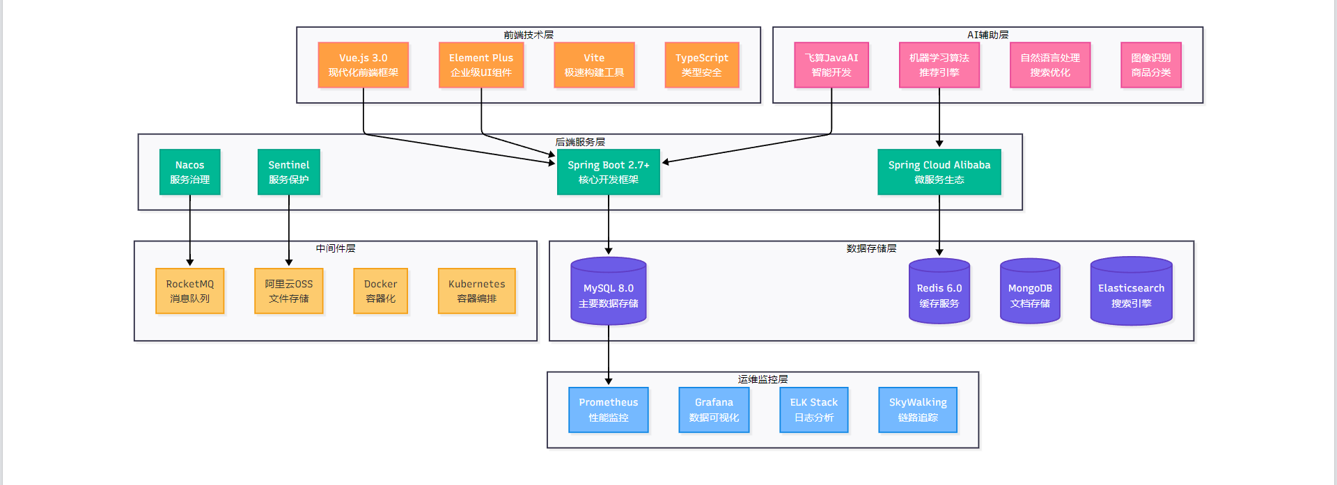 框架选择: 采用Spring Boot 2.7+作为后端开发的核心框架,结合Spring Cloud Alibaba构建稳定可靠的微服务生态体系。这套"黄金组合"不仅提供了丰富的开发组件和中间件集成能力,更具备出色的可扩展性和维护性,能够轻松应对电商系统的复杂业务场景和高并发访问需求。