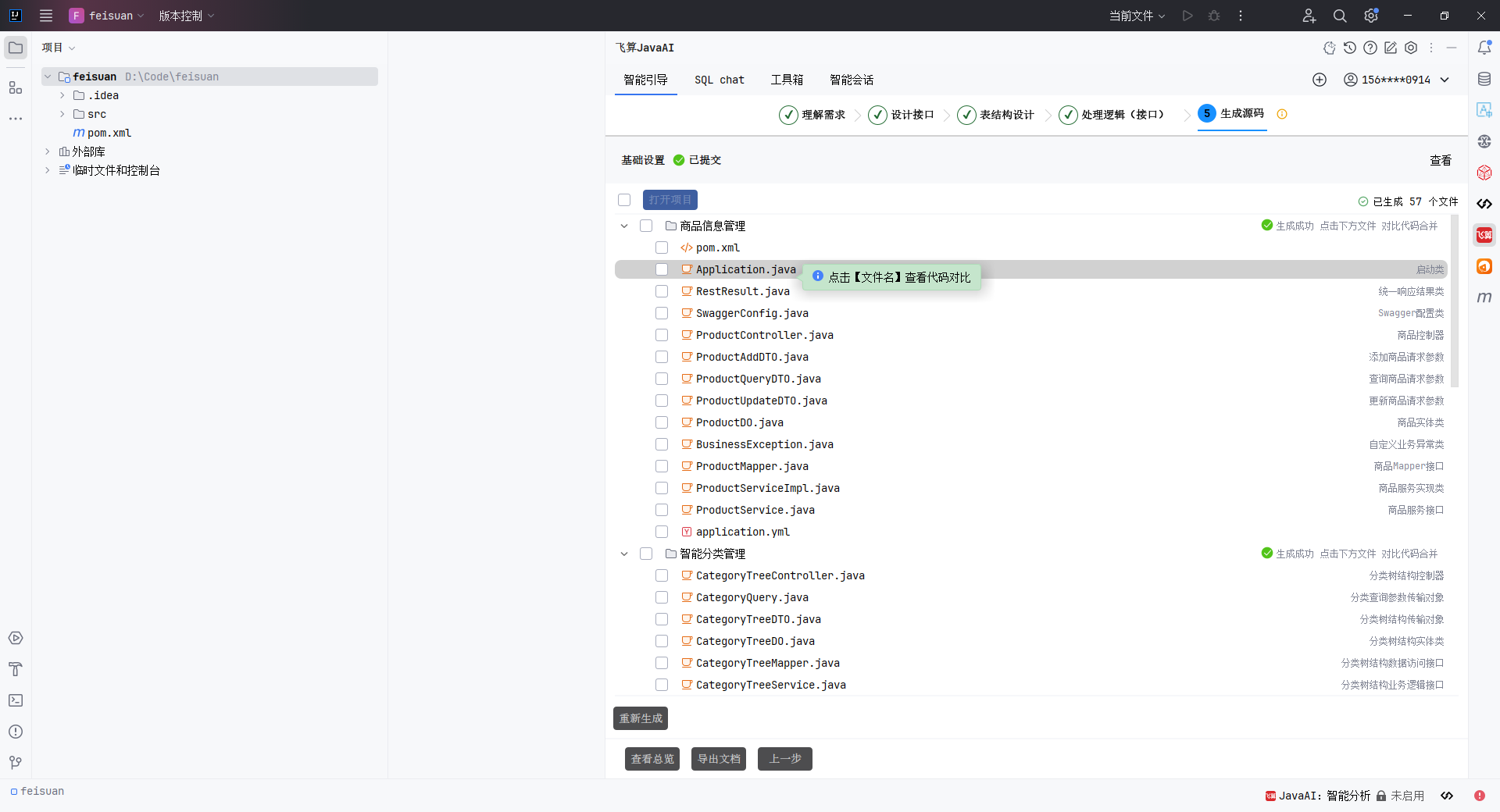 经过了前四个阶段,飞算AI已经分析完毕,现在可以进行源码的生成了,点击开始,等待一段时间