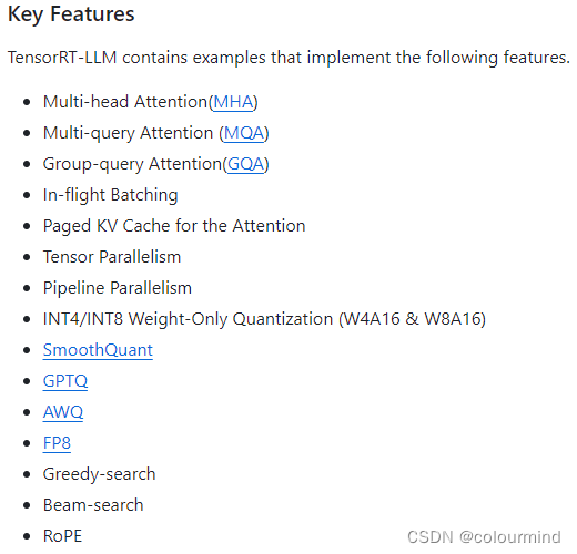 各种attention版本、in-flight batching(也就是continuous batching)、pagedAttention、张量并行、流水线并行、各种量化技术SQ、AWQ以及新的数据类型FP8的支持。同时结合tensorrt高效的cuda算子、层融合、精度校准和内核选择等技术,使得它的推理效率更为高效。下面简单的介绍一下各种量化技术