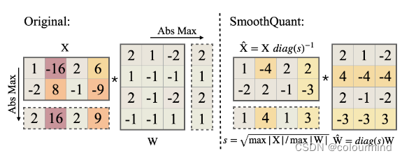 论文SmoothQuant: Accurate and Efficient Post-Training Quantization for Large Language Models中的示意图展示的比较清楚,原始的量化由于激活值分布不均匀有异常值很难量化,权重分布比较均匀very easy量化;smoothquant对激活值和权重分别进行平滑和扩大后,激活值变得平滑一下,权重稍微变得那么平滑,但是它们量化难度都是比较容易量化。同时为了调控权重和激活值的量化难度的程度或者或激活值的量化难度向权重值偏移多少设置了一个平滑系数α: