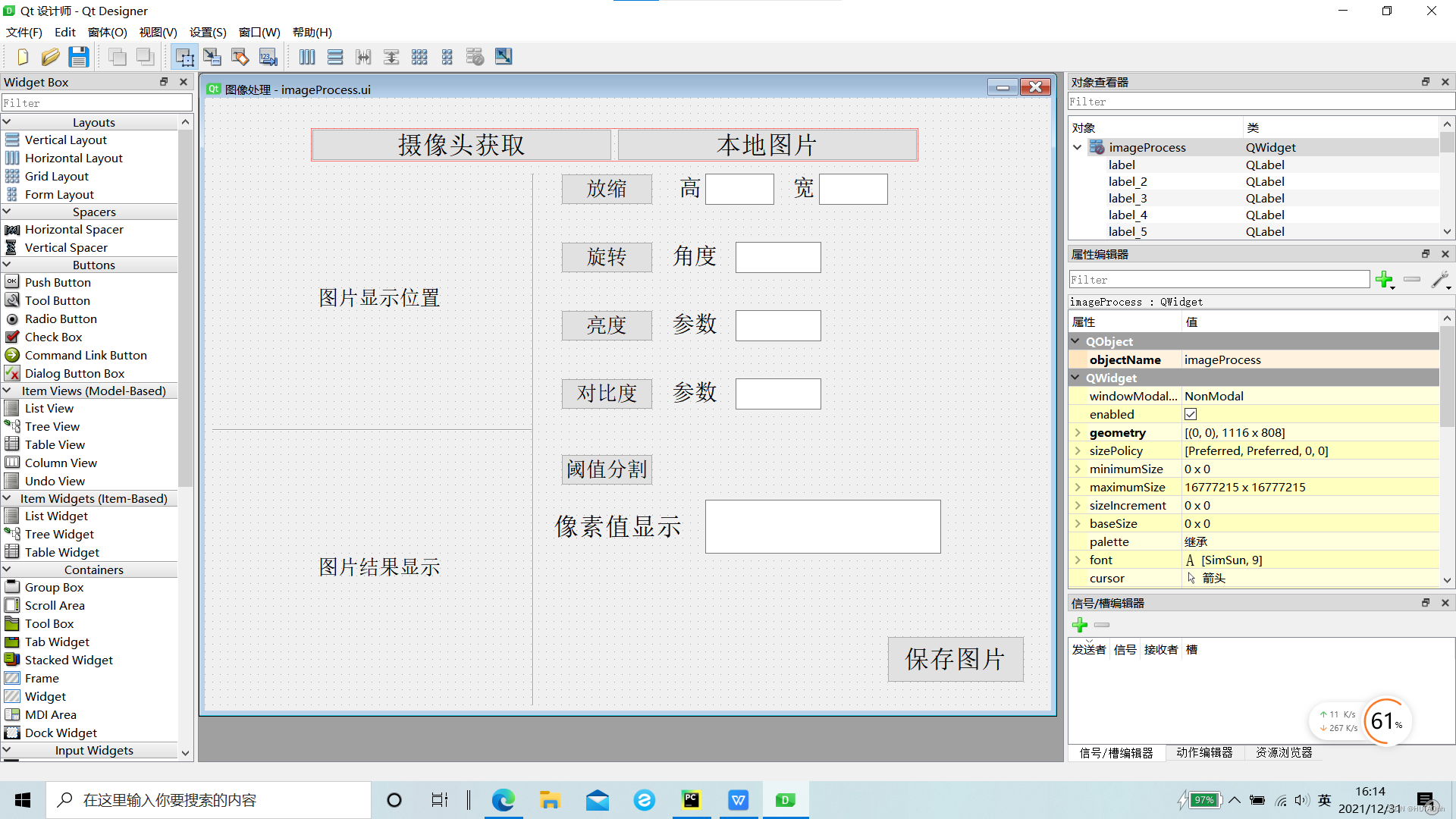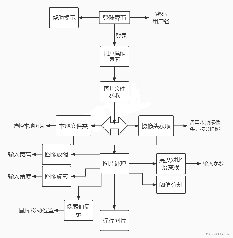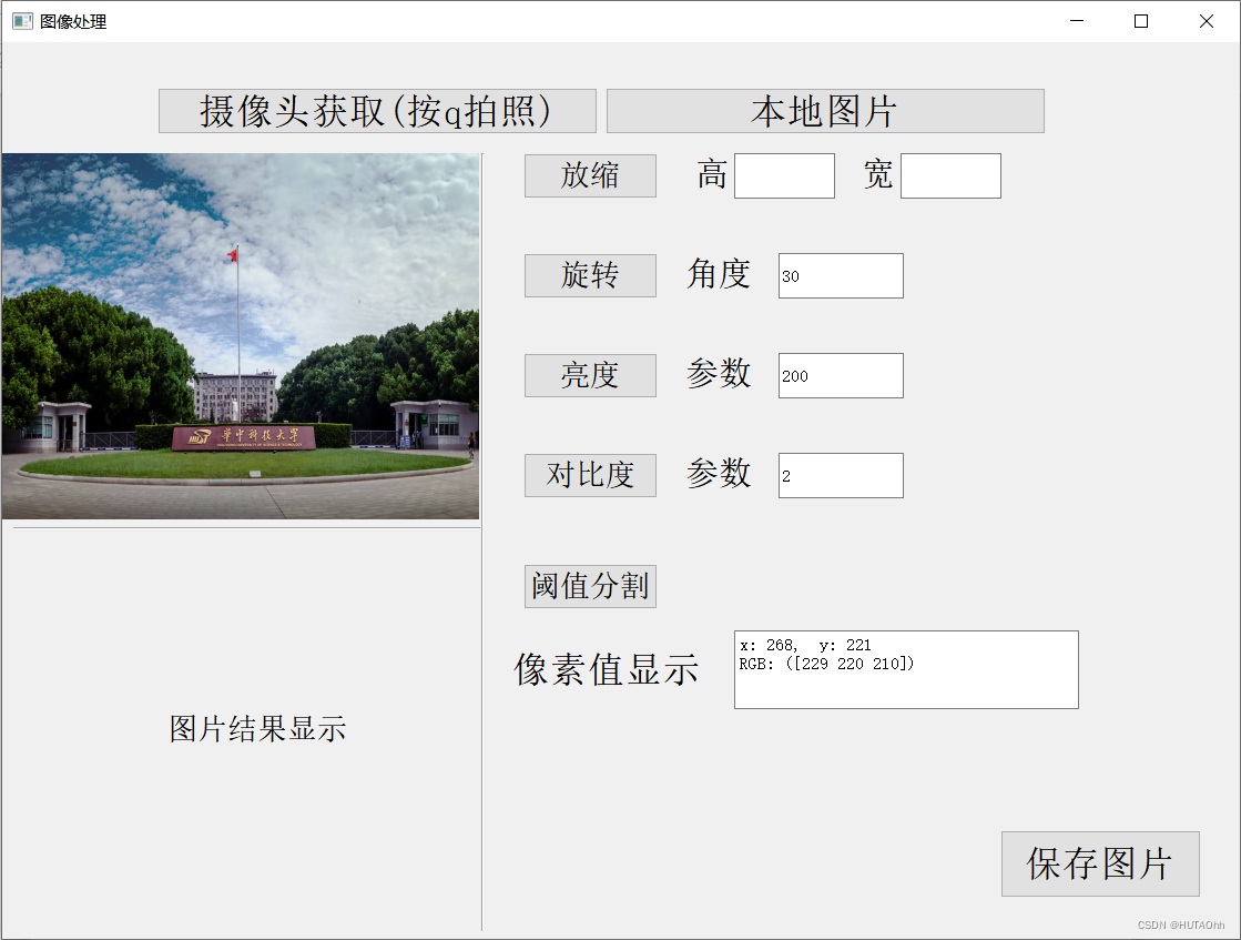 本文介绍了一个使用Python和Qt设计的图像处理系统,包括登录功能、摄像头拍照、图像放缩、旋转、亮度对比度调整、阈值分割、像素值显示及保存图片等操作。系统采用双线性插值算法进行图像放缩,利用opencv进行图像处理,并提供了直观的像素值显示功能。用户友好且易于操作,具备一定的图像处理基础功能。