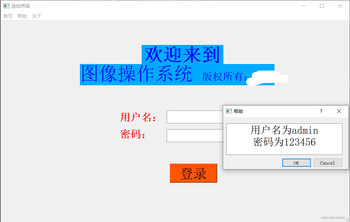 在用户输入好用户名和密码后,点击登录按钮,触发login函数,这时会用判断语句判断用户名和密码是否正确,正确则成功登录,如果不正确,则弹出帮助窗口,该窗口直接显示正确的用户名和密码。