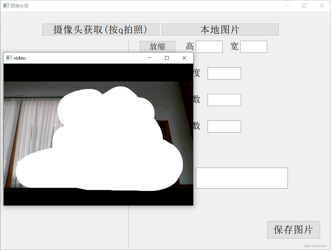 本系统专门设计了一个利用电脑摄像头获取图片的功能,当用户点击该按钮时,会触发摄像头调用函数,并用opencv用窗口每隔100ms将捕获的帧显示出来,这时用户按下q键即可进行拍照,并将照片显示在界面上,其原理就是将最后一帧保留。