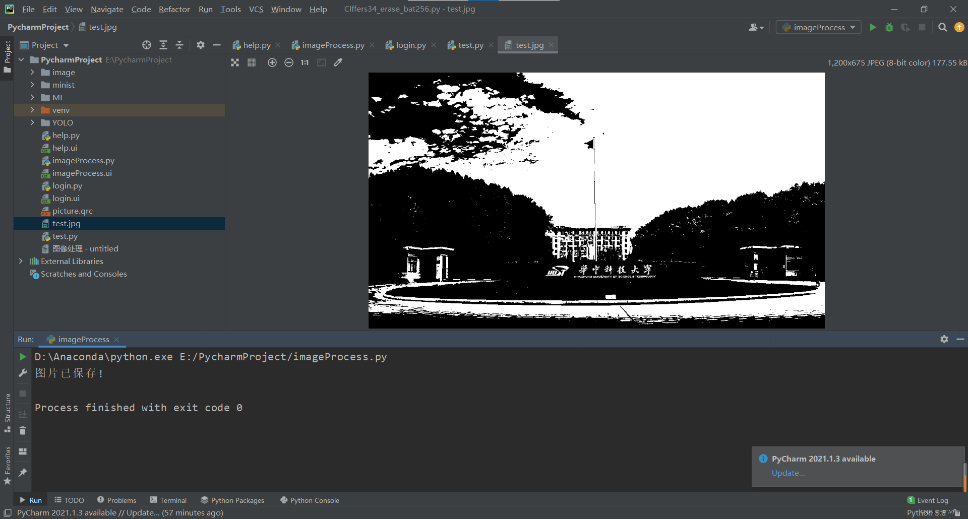 在用户每进行一个操作后,都可以点击保存图片按钮,这时会将显示过的图片保存在当前代码所在目录下,格式为.jpg,并显示保存成功。 用户可以保存任意次数,当用户没有进行任何操作时,则会输出提醒语句.