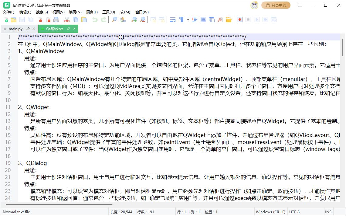 内置布局区域:QMainWindow有几个特定的布局区域,如中央部件区域(centralWidget)、顶部菜单栏(menuBar)、工具栏区域(addToolBar)和状态栏(statusBar)。中央部件区域用于放置主要的内容,比如在文本编辑器中,文本编辑框就是中央部件;菜单栏可以添加各种菜单选项,如 “文件”“编辑”“视图” 等;工具栏可以放置常用功能的快捷按钮;状态栏用于显示一些状态信息,如当前文件路径、光标位置等。