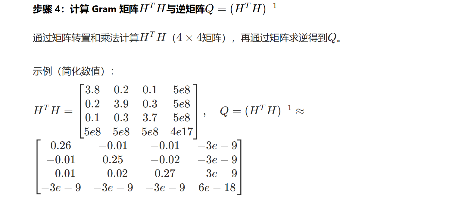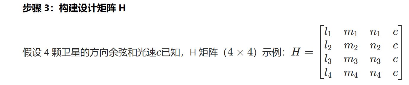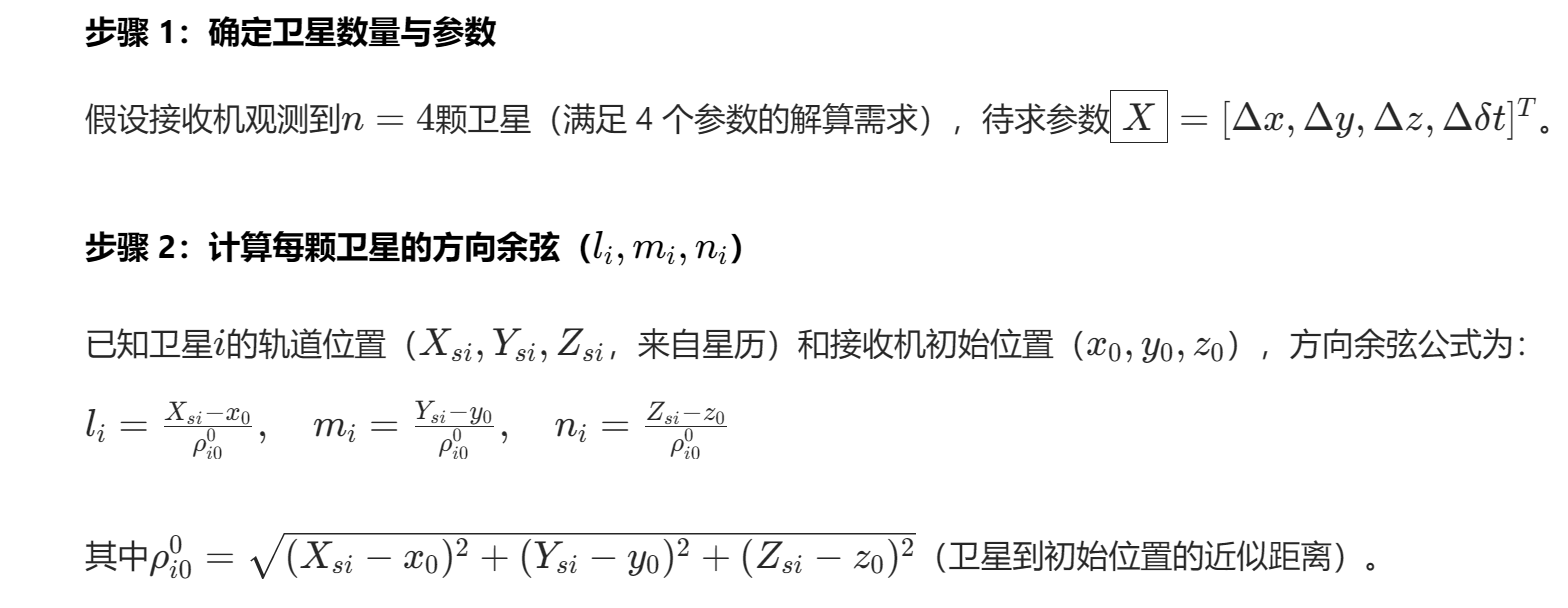 假设 4 颗卫星(编号 1-4)的轨道位置和接收机初始位置如下(简化数值,便于计算):