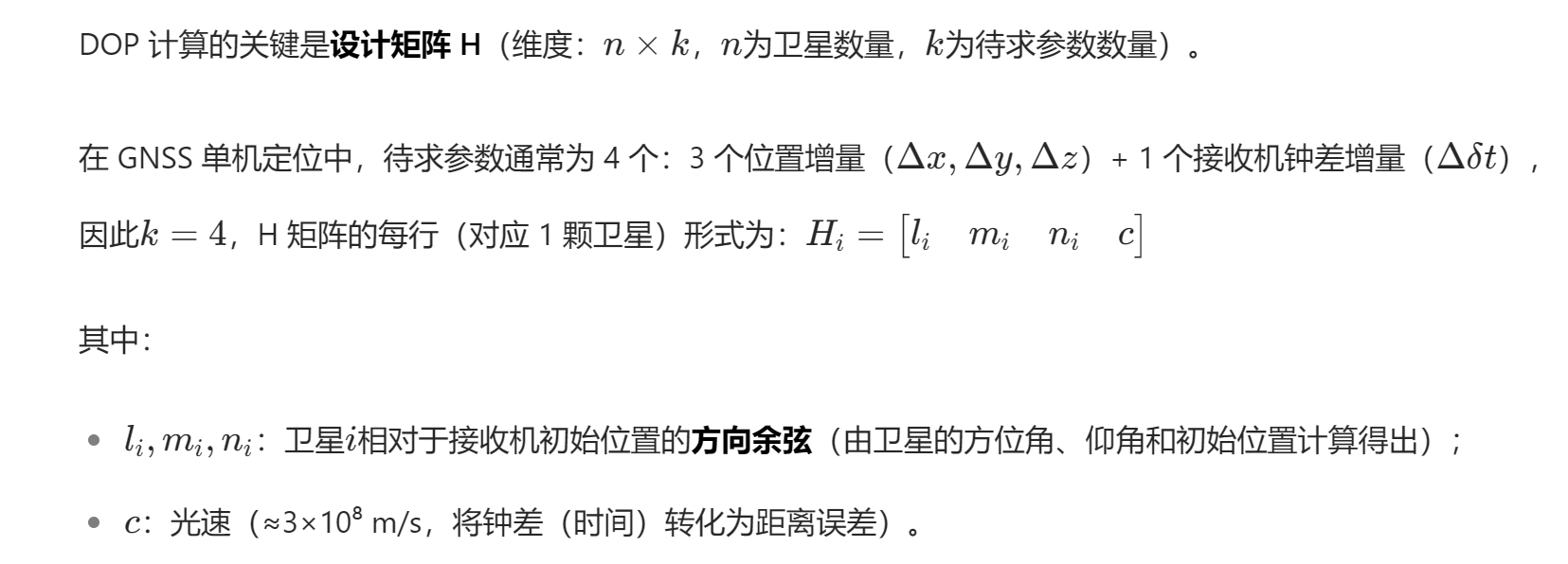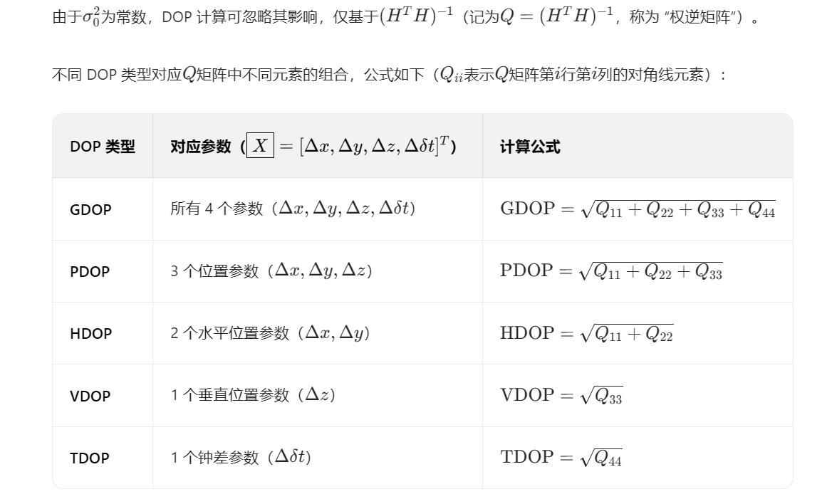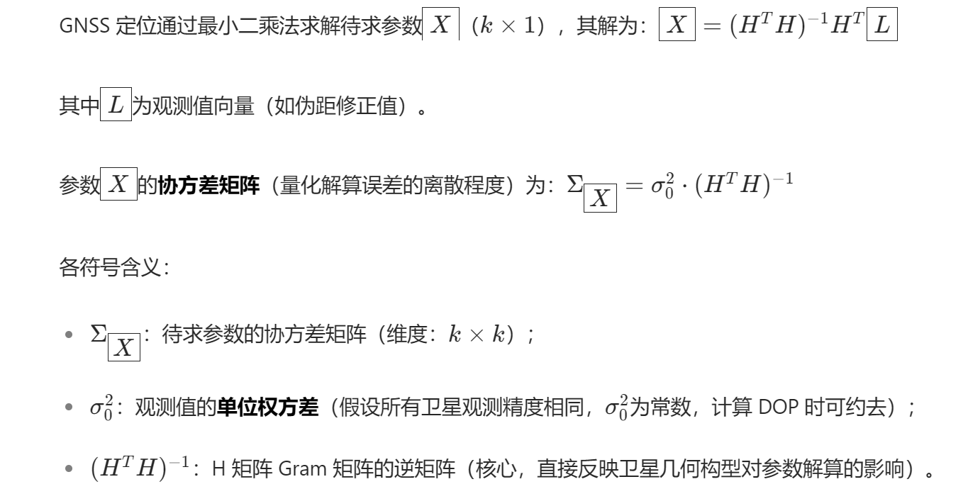 计算核心:基于设计矩阵 H 的协方差矩阵,不同 DOP 对应参数误差的不同组合;
