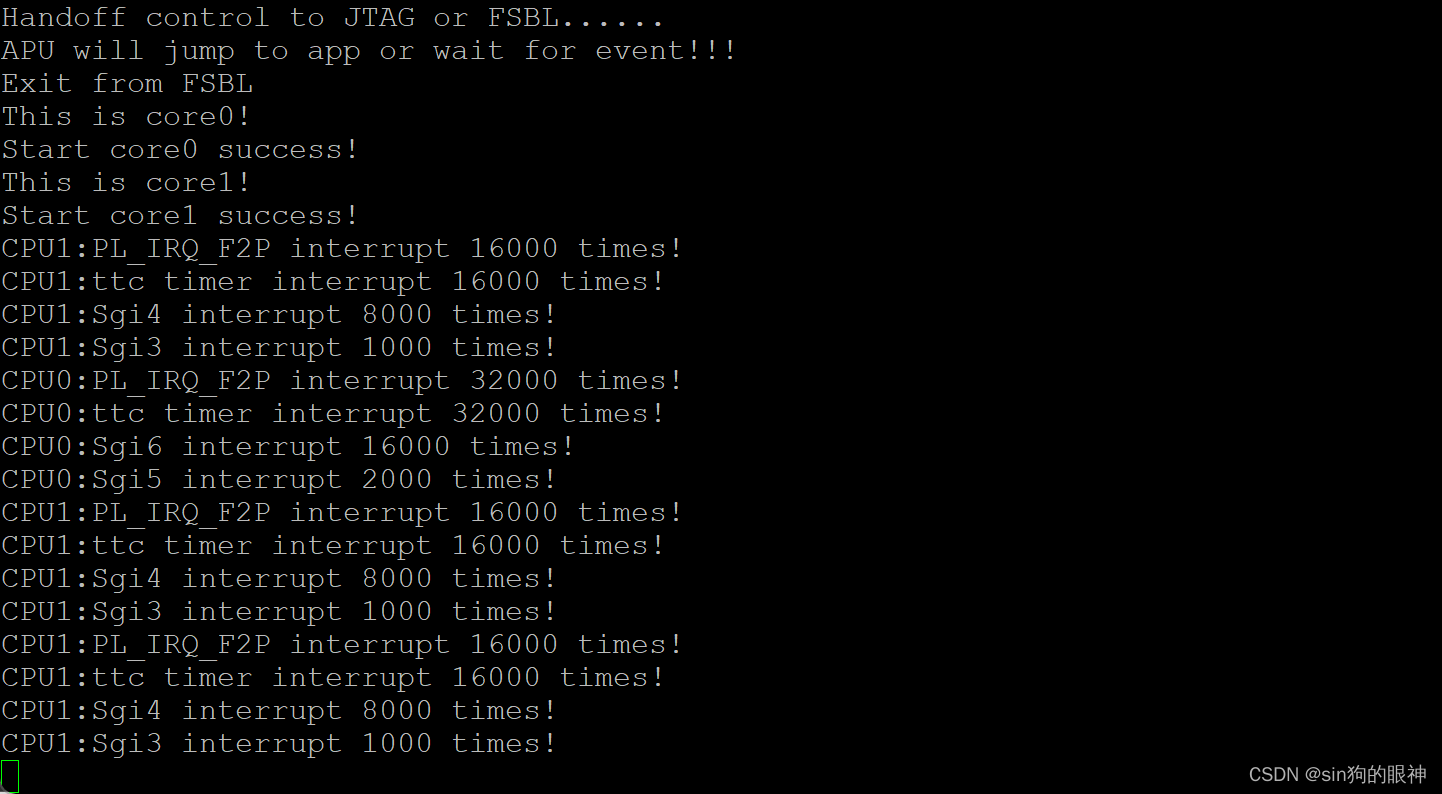 fmql20s484实现双核中断时序系统 PL生成16k的中断信号,发给两个core core0 core1。两个core以此为基准分别调用ttc定时器,延时20us之后触发ttc中断,ttc中断服务函数中,通过全局变量来进行分频,生成8k的sgi中断,再生成1k的sgi中断。之后通过轮询模式实现核间通信,实现ing。