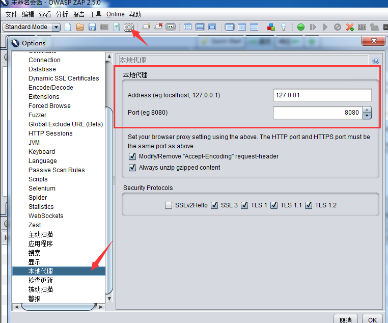 将owasp zap 的本地代理设置成127.0.0.1 端口8080