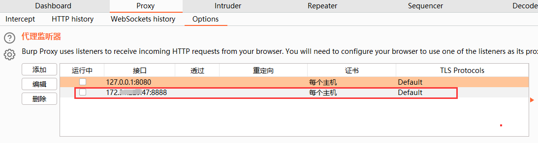 证书安装以后,配置代理,这里跟web端抓包也是一样的。让手机和电脑处于同一网络下,在burp->Proxy->Options这里添加监听器,ip是电脑ip,端口随意设置即可,其余的都不用修改