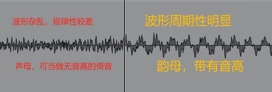 这是因为元音是声带振动发声,基频响度高,因此在波形上能够呈现出大幅度、较低频的振动;