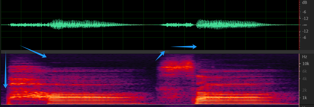 比如bp dt gk 这三对爆破音,在频谱图和波形图上会表现为一个突然的脉冲,当然,歌手咬字顺畅也不会故意去强调这个音头,所以可能并不是很明显。