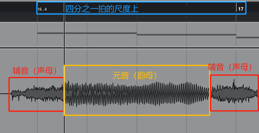 如果bpm在100-200这个范围,让大概四分之一拍的波形铺在你的窗口上,对比会更加明显,辅音会看起来非常致密,而元音已经能够看出有着明显的上下波动,可以根据这些特征来识别元音与辅音。