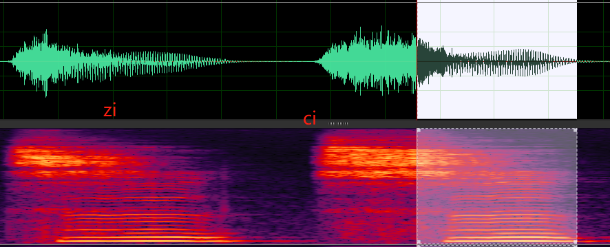 另外一个很有趣的现象,单独框选白色区域试听时,人脑对这个音的识别是zi,两者的差距只有送气时间而已,另外,对于c这个辅音音(ts)超过了爆破音头这么久却没有形成s的听感,是否也可以从侧面说明这个音在持阻阶段也被充分t化了?