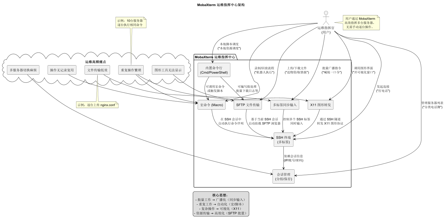 新手觉得 MobaXterm 只是 “SSH 终端”,其实它是一套完整的 “运维指挥中心”—— 各组件如同指挥中心的不同职能部门,分工协作覆盖从 “通讯”“补给” 到 “自动化执行” 的全流程: