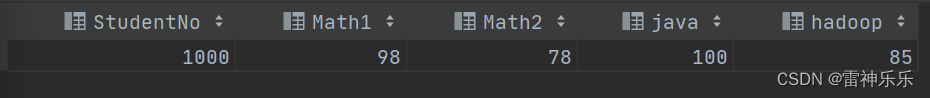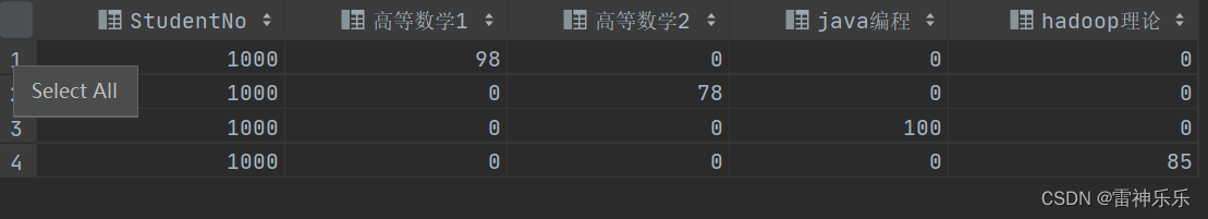 select StudentNo, MAX(高等数学1) math1, MAX(高等数学2) math2, MAX(java编程) java, MAX(hadoop理论) hadoop