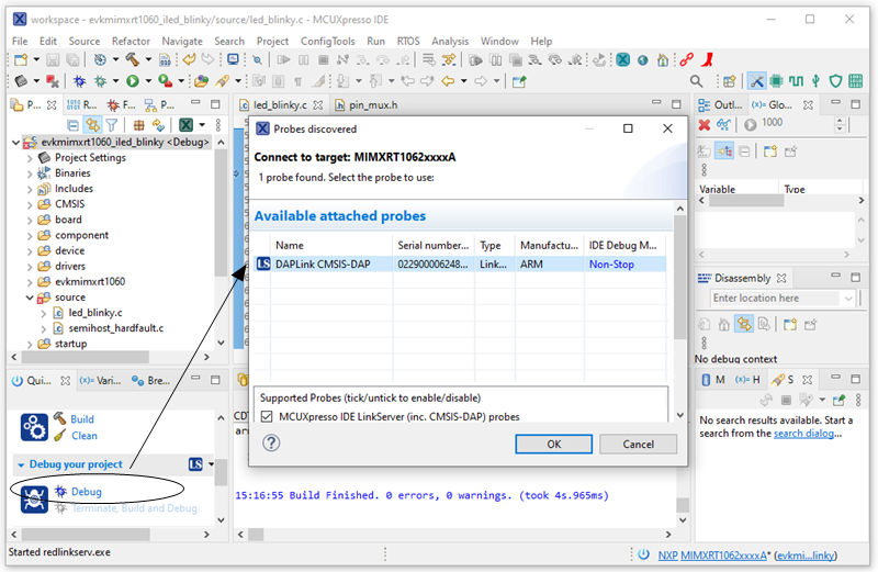 工程编译结束后,还差最后一步,就是在左下角 Debug your project 窗口里点击 Debug 按钮,这时候 IDE 会自动发现当前可用的调试器 DAPLink CMSIS-DAP,选中它便可以进入调试界面,这时断点应该停在 main 函数里,按 F8(Resume) 键程序便直接跑起来,母板上的蓝色 LED 灯(D8)此时应该在对你眨眼。