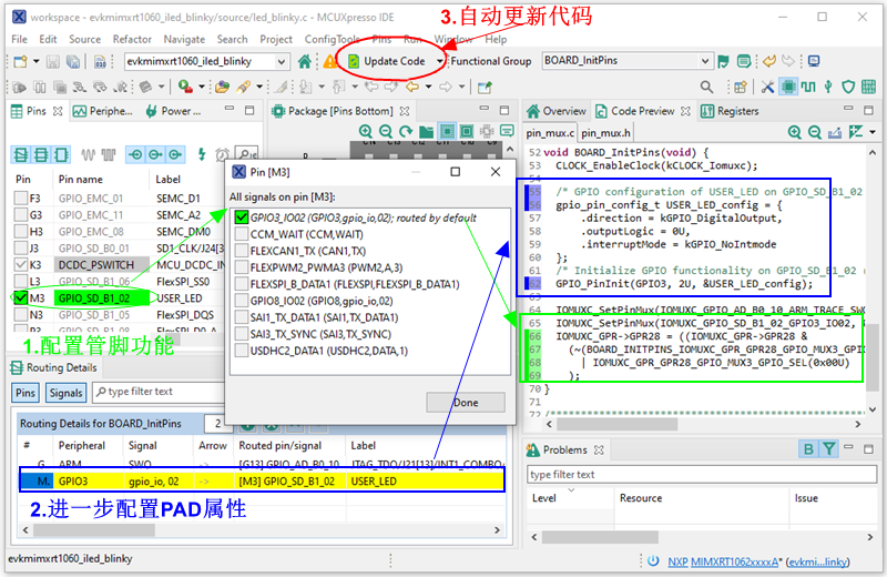 在 Pin Tool 组件左侧 Pins 窗口里将原来 GPIO_AD_B0_09 勾选去掉,重新选择 GPIO_SD_B1_02,并且配置为 GPIO3_IO02,然后在下面 Routing Details 窗口里进一步配置其 PAD 属性为 Output,操作过程中可以实时看到 pin_mux.c 源文件里的代码变化,最后点击上方 Update Code 按钮,代码会自动更新,至此代码改动就完成了。(关于 MCUXpresso Config Tool 原理详见痞子衡旧文 《MCUXpresso Config Tools初体验(Pins, Clocks, Peripherals)》)