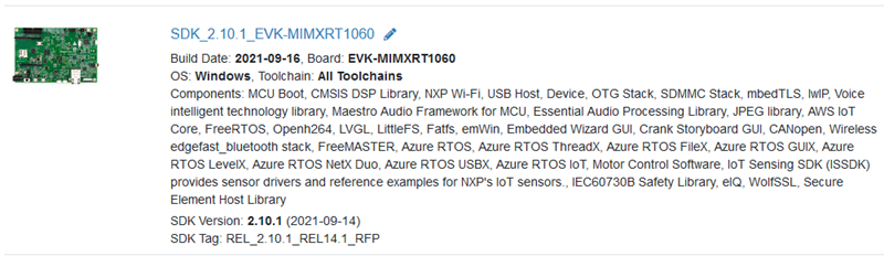 注册并登录恩智浦官网,来到 MCUXpresso SDK Builder 页面,在 "Select Development Board" 里选择 EVK-MIMXRT1060 后点击 Build MCUXpresso SDK 后跳转到下一个页面,在 "Developer Environment Settings" 里选择全部 Toolchain 以及 Component 并点击 Download SDK 后便可得到 SDK_2.10.1_EVK-MIMXRT1060.zip,下面是痞子衡下载的开发包具体版本信息: