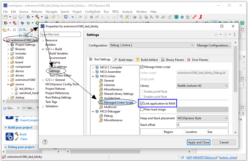修改完 LED 管脚代码后,为了调试方便,我们在工程属性里勾选上 Link application to RAM 选项,即将代码全部链接到 i.MXRT1062 内部 TCM 里,然后编译工程。这里不明白的话详见痞子衡旧文 《MCUXpresso IDE下工程链接文件配置管理与自动生成机制》。在内部 RAM 里调试不涉及 Flash 下载算法,过程比较简单,适用于早期代码评估。