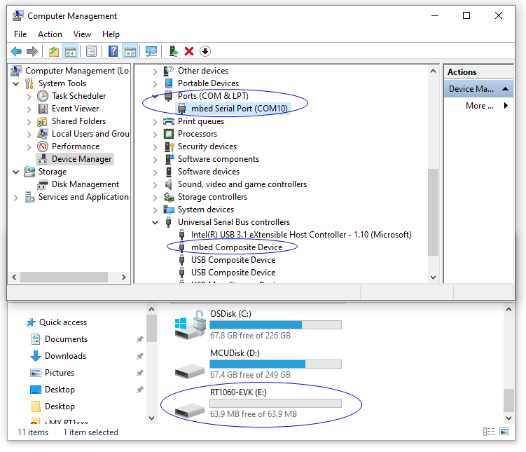 板卡通过 J1 口供电后,如果你可以看到如下三处地方(新增名为 RT1060-EVK 盘符、设备管理器里新增 mbed Serial Port 串口号、mbed Composite Device USB 控制器),说明板载 DAP-Link 调试器是正常的。