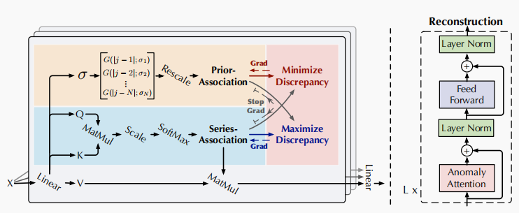 因此本文提出了一种基于Transformer结构的异常检测网络,将原本的自注意力修改为Anomaly-Attention,包含两个分支结构,分别建模每个时间点的prior association和series association,先验关联是通过一个可学习的高斯核来表示与周围数据点的关联性,序列关联则就是通过自注意力权重来进行表示。