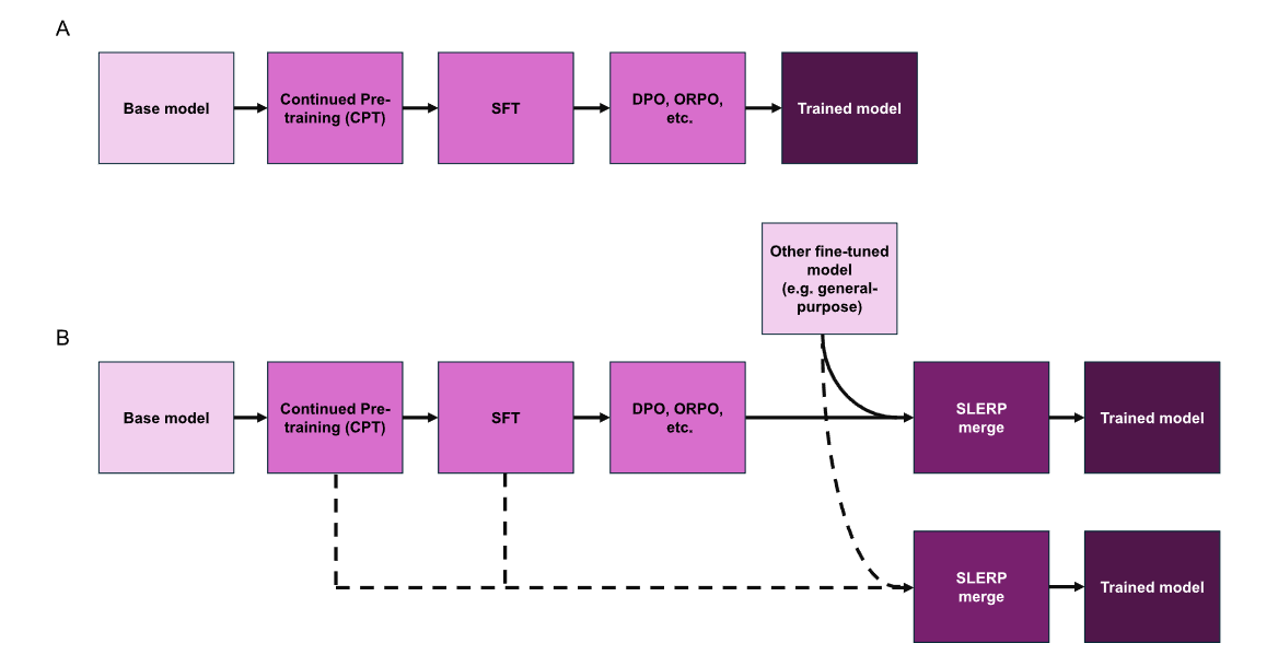 图中A为常规方法,B为本文方法。本文的领域适配通过 “多阶段微调 + SLERP 模型融合” 实现,提出了系统化的 LLM 领域适配框架,既保留通用能力又注入领域专业知识,具体做法如下: