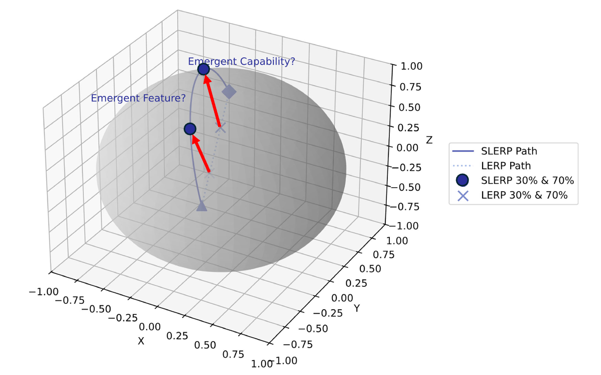 - 文章通过数学推导证明:SLERP 的插值公式(含正弦函数调节)能让参数组合产生 “新的特征激活”(比如原本 A 模型的参数 θ₁和 B 模型的 θ₂,融合后会激活新的特征 φᵢ),这正是涌现能力的来源。