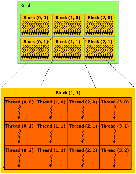 这些同样维度和大小的块将组织为一个一维或二维线程块网格(Grid)。
