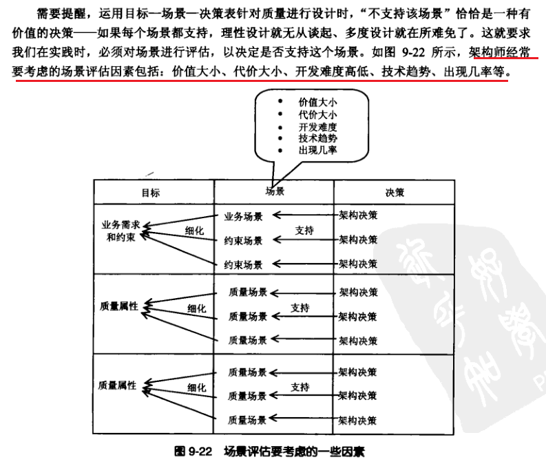 而概念设计时,正好是相反的,即:目标需求,如质量属性 =》分解成质量场景 =》设计决策,决定哪些场景是支持的,哪些场景是不支持的。