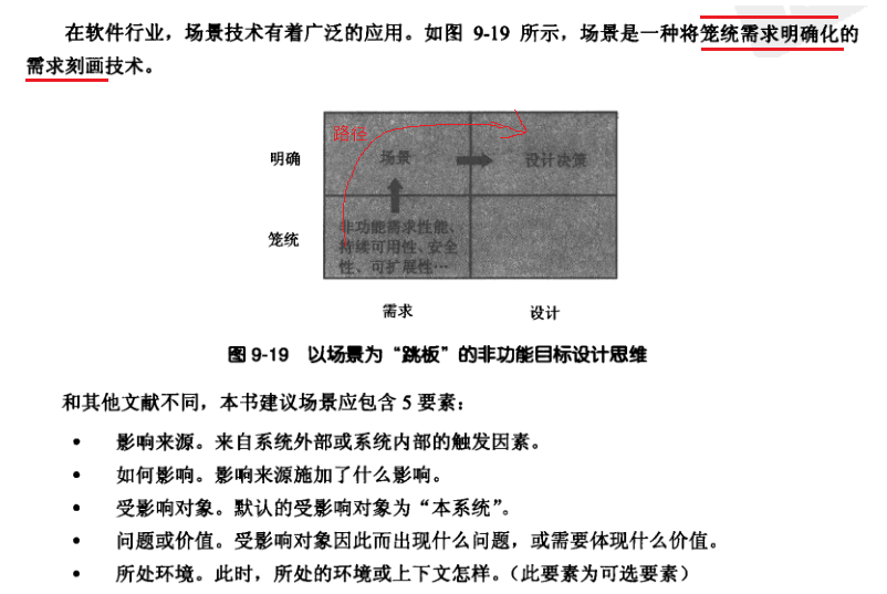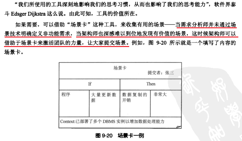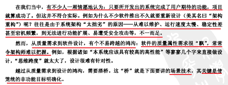 但在现实中,很多需求分析师,只给出功能性需求,非功能性需求都是架构师去挖掘的,更谈不上需求分析师把非功能性需求转换成场景了。这个活,就落在了架构师的身上,如果架构师也没有进行转换,就只能靠程序之间的造化了。