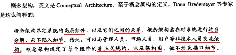 概念架构设计:把系统这个黑盒子打开,站在系统内部,通过设计内部模块的组织架构,分配内部模块的职责和功能,从而使得系统满足客户对其的期望和诉求。