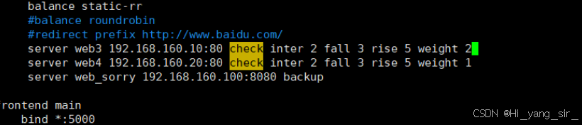 server web3 192.168.160.10:80 check inter 2 fall 3 rise 5 weight 2