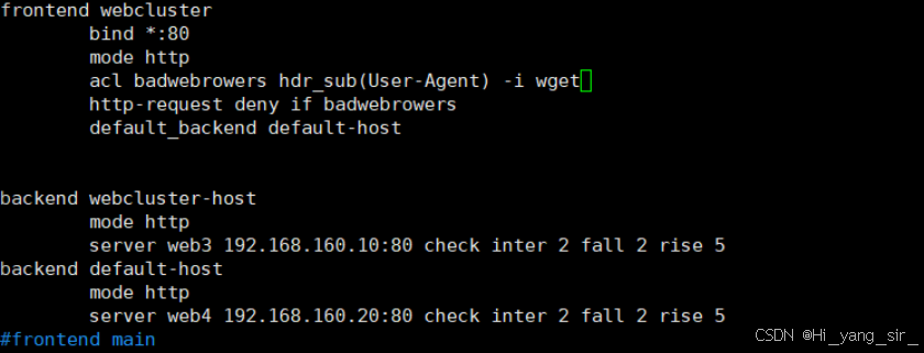 server web4 192.168.160.20:80 check inter 2 fall 3 rise 5 weight 1
