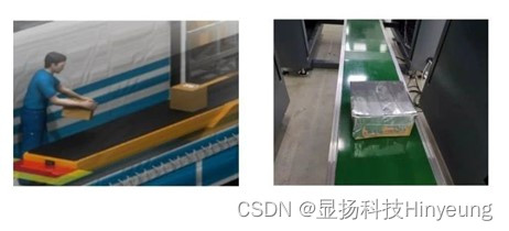 显扬科技自主研发的高速高清三维机器视觉设备HY-M5对传送带上的不规则物体、箱包进行轮廓扫描,速度最快可达10Hz。