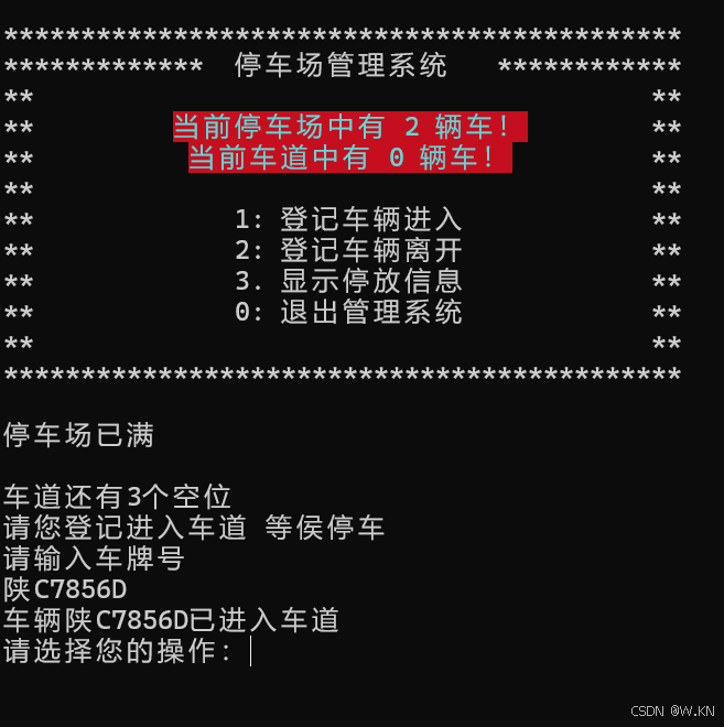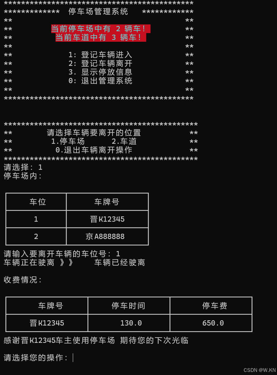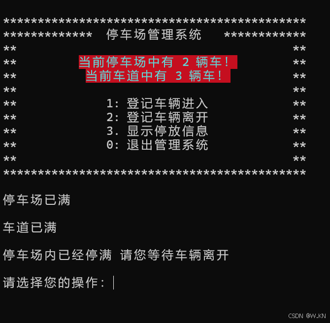 (这其实只是我们规则假设的一种情况,方便我们去计算等候时间,按照实际情况,不可能所有车移动和等候的时间是规则的,如果想更贴近这种情况,可以去定义一个函数:当车辆离开停车场时,记录当前时刻并将该车辆的标记值设为1(默认为0)等车辆回到停车场时再记录时刻,去计算等待时间。我们在系统中可以使用输入1来表示让一辆车离开,输入0表示一辆车进入。当然,这也只是模拟的一个过程,本次程序并没有实现这个功能,欢迎有实现了该功能的同学在评论区分享交流)