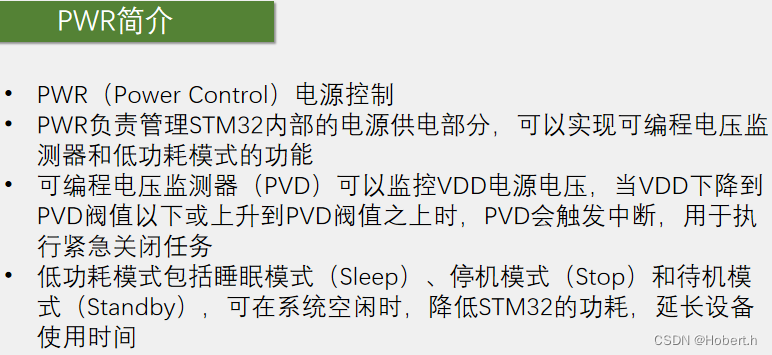 32PWR电源控制 芯片在睡眠模式下不能进行下载程序只有外部中断才可以实现唤醒停止模式USB和ETH可以通过其WeakUp,唤醒信号接道EXTI外部中断电压过低的情况下,可能会导致内部或外部电路发送不确定的错误低功耗模式针对,数据采集器,车钥匙,遥控器,报警器等等外部中断的工作是不需要时钟的 ,EXTI不需要时钟。